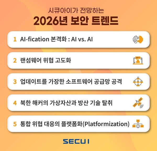 시큐아이는 2026년 5가지 보안 트렌드로 AI-fication 본격화, 랜섬웨어 위협 고도화, 업데이트를 가장한 소프트웨어 공급망 공격, 북한 해커의 가상자산과 방산 기술 탈취, 통합 위협 대응의 플랫폼화를 선정했다.